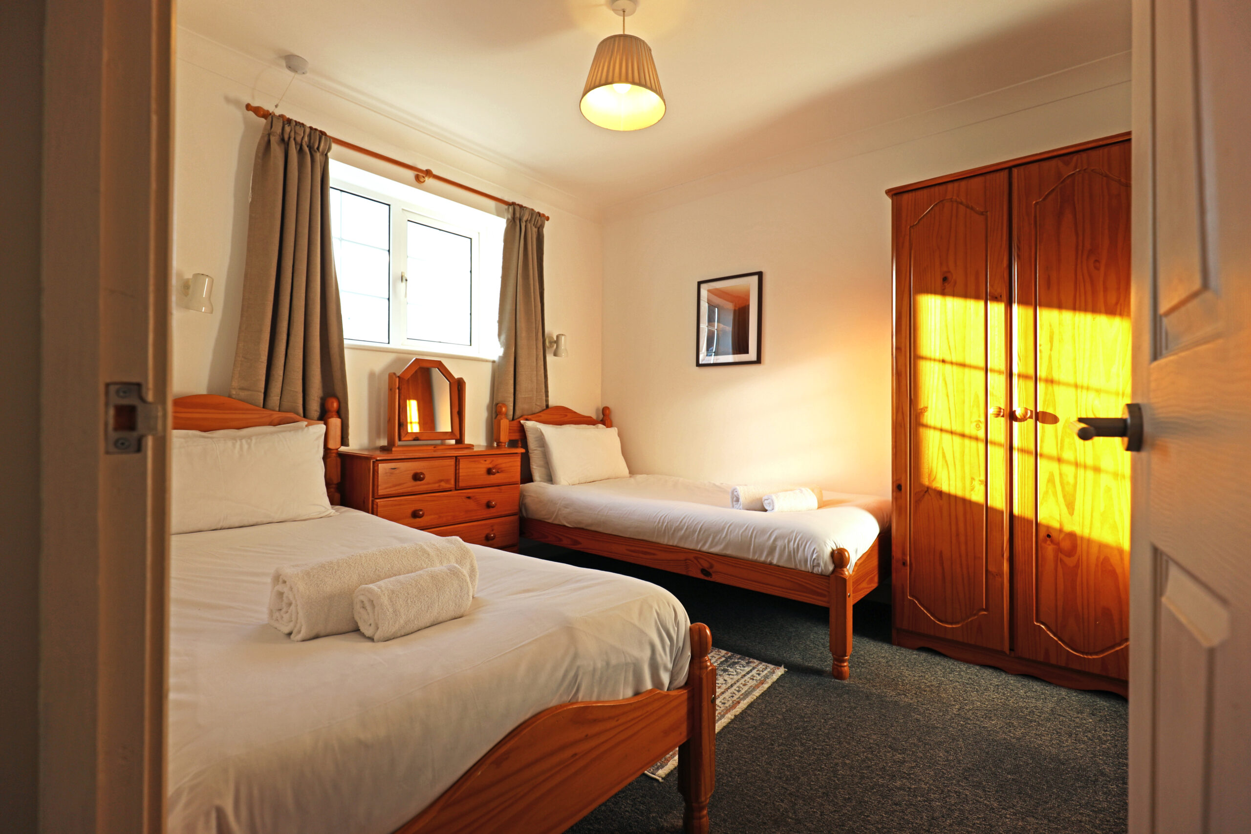 There are two bedrooms, one with a double bed and the other with two full size single beds, bathroom with shower over bath.